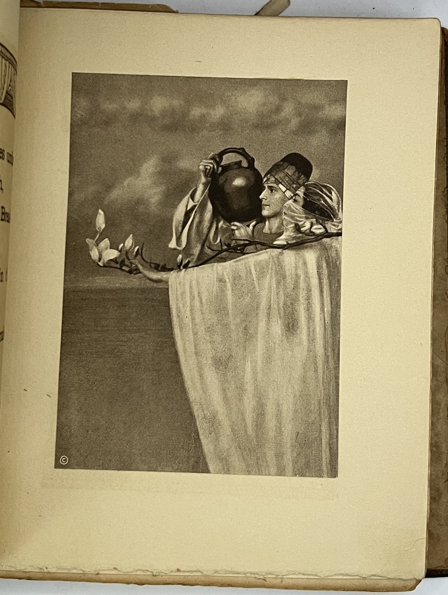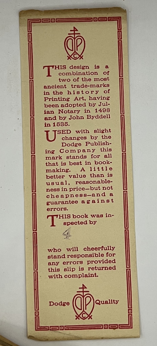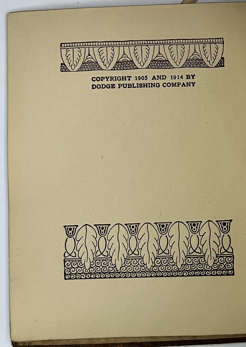 It looks very similar to this 1914 Dodge Hanscom edition. I happened to take pictures of 3/4 of the same pieces of art. I am calling this the leather cover version as the leatheriness of the cover is very bold. My copy is in very rough shape.