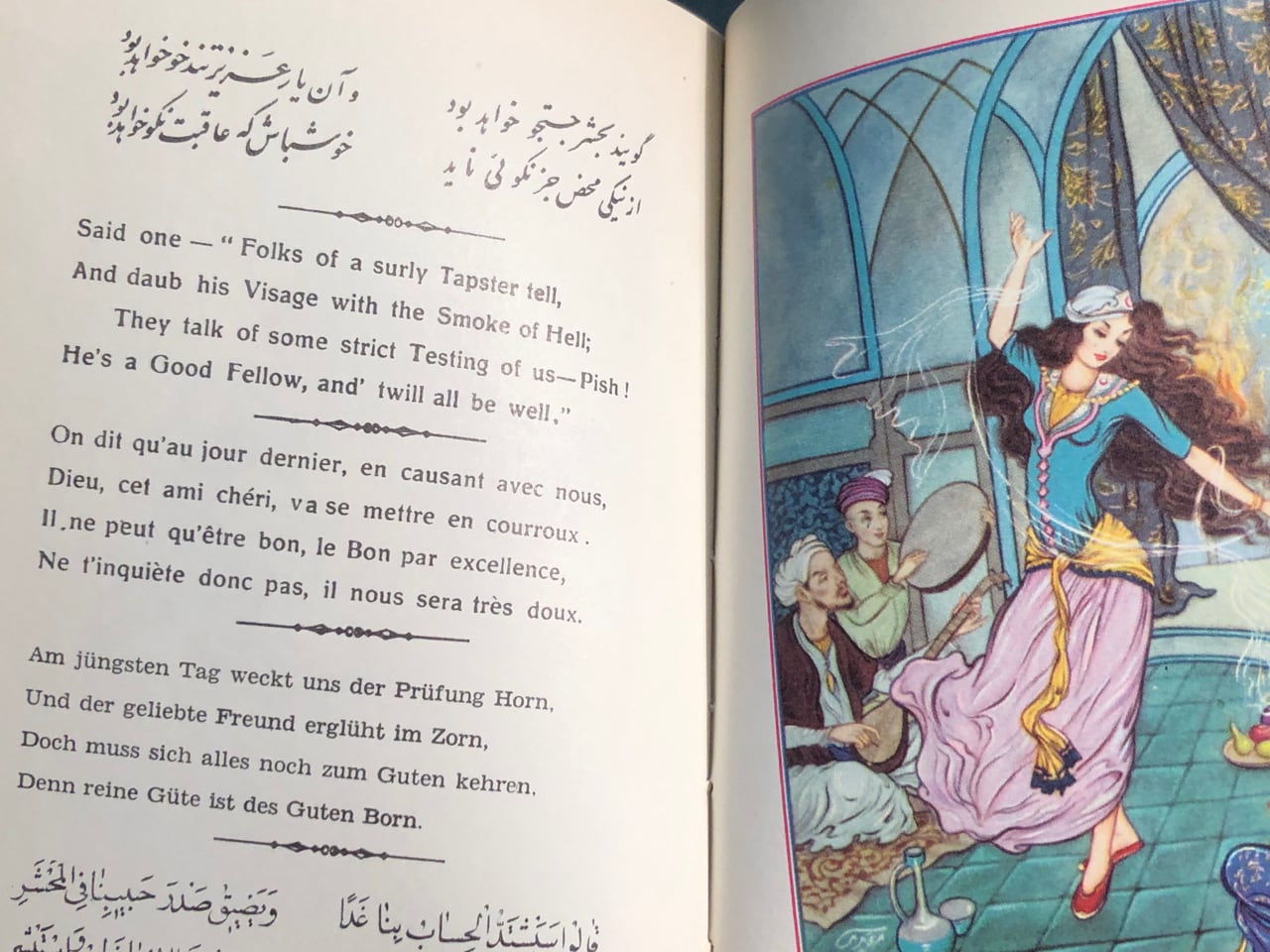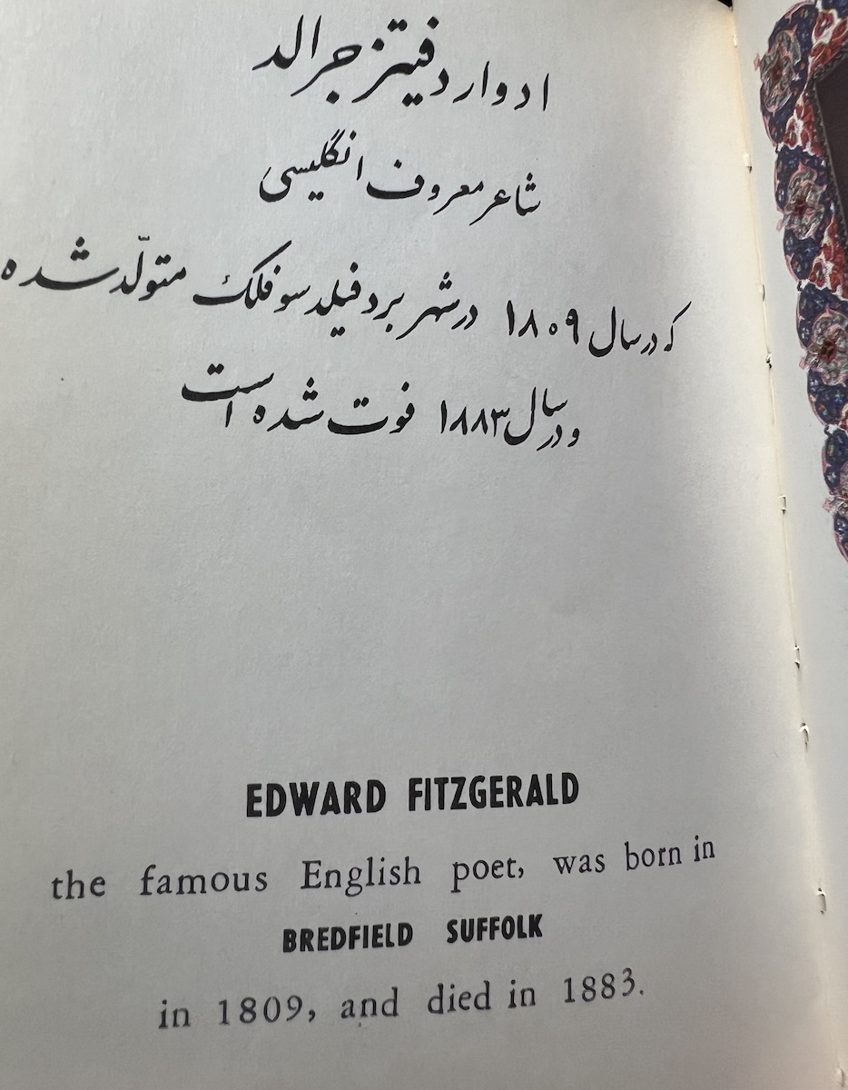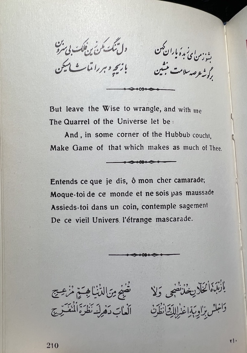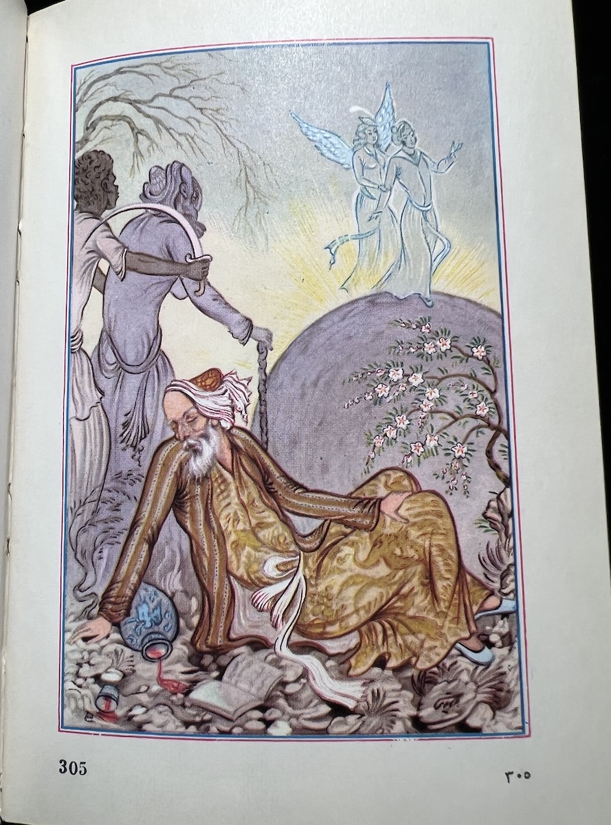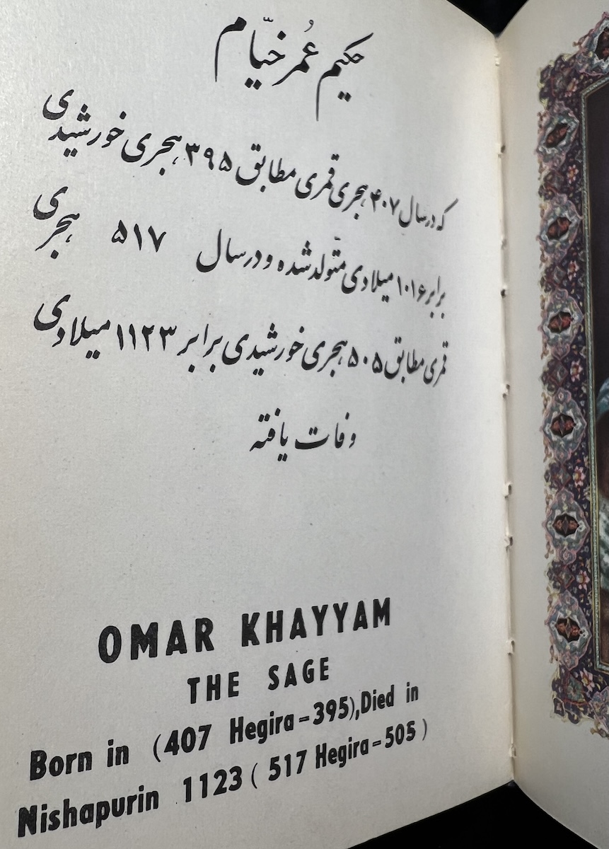 This Iranian edition from the Tahrir Iran Co., with illustrations from Akbar Tajvidi contains five different translations: English, Persian/Farsi, French, German (sans 8 quatrains), and Arabic. Fitzgerald’s is used for the English tranaslations, and due to that, it is limited to 75 quatrains. The publishers’ foreward explains in detail their reasoning and choices.