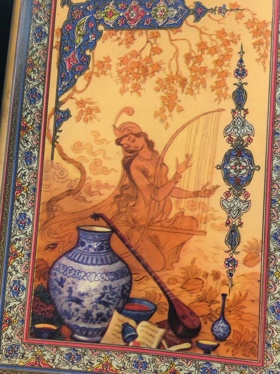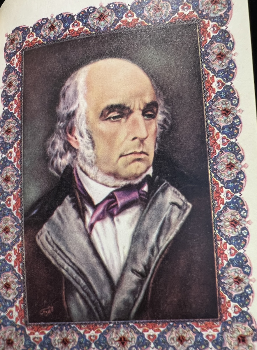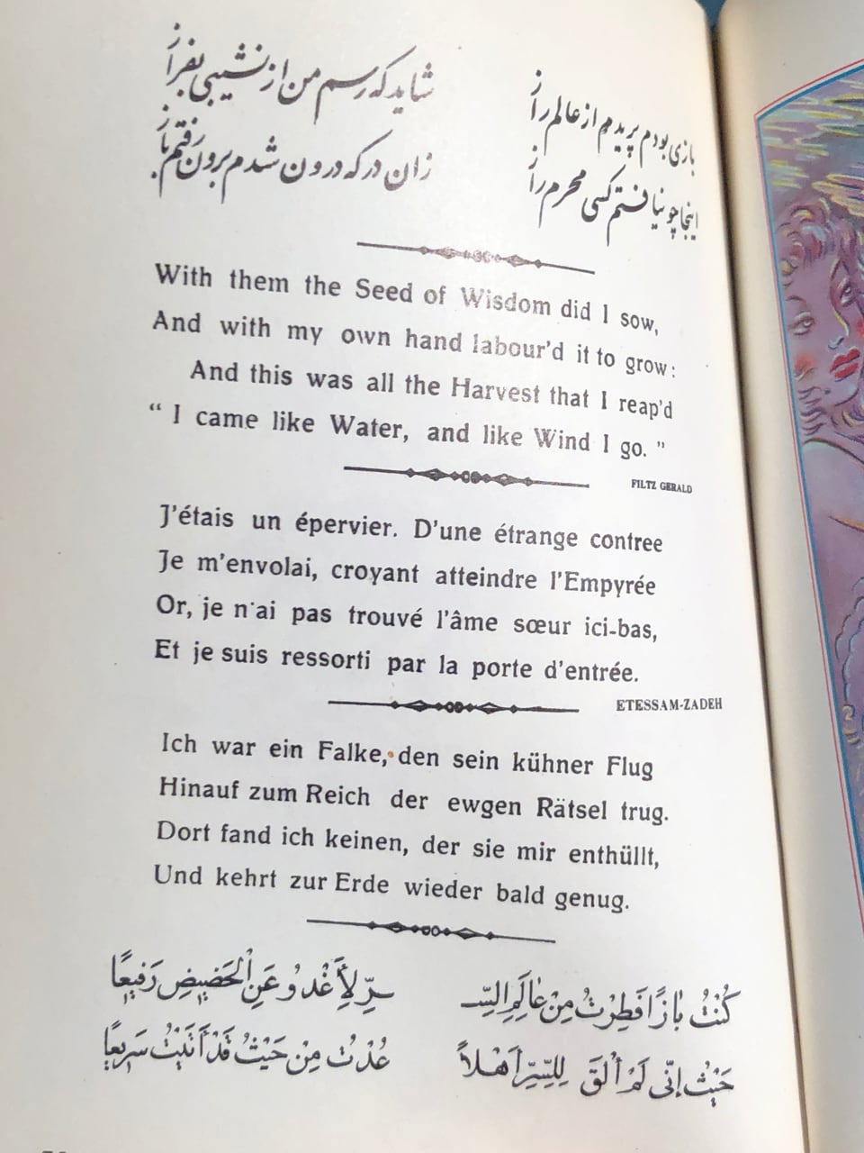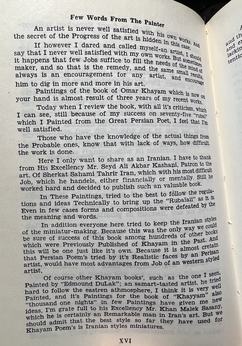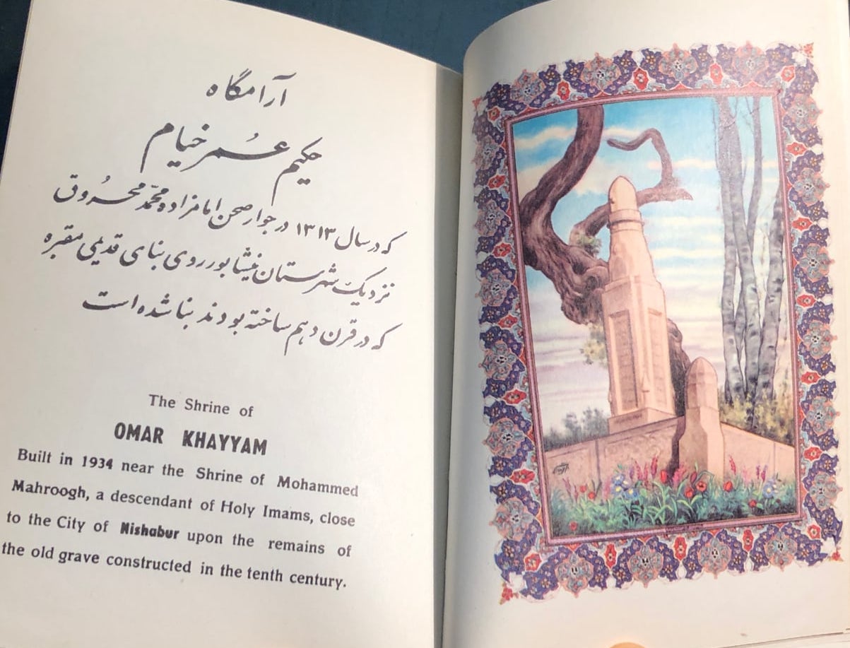 This Iranian edition from the Tahrir Iran Co., with illustrations from Akbar Tajvidi contains five different translations: English, Persian/Farsi, French, German (sans 8 quatrains), and Arabic. Fitzgerald’s is used for the English tranaslations, and due to that, it is limited to 75 quatrains. The publishers’ foreward explains in detail their reasoning and choices.