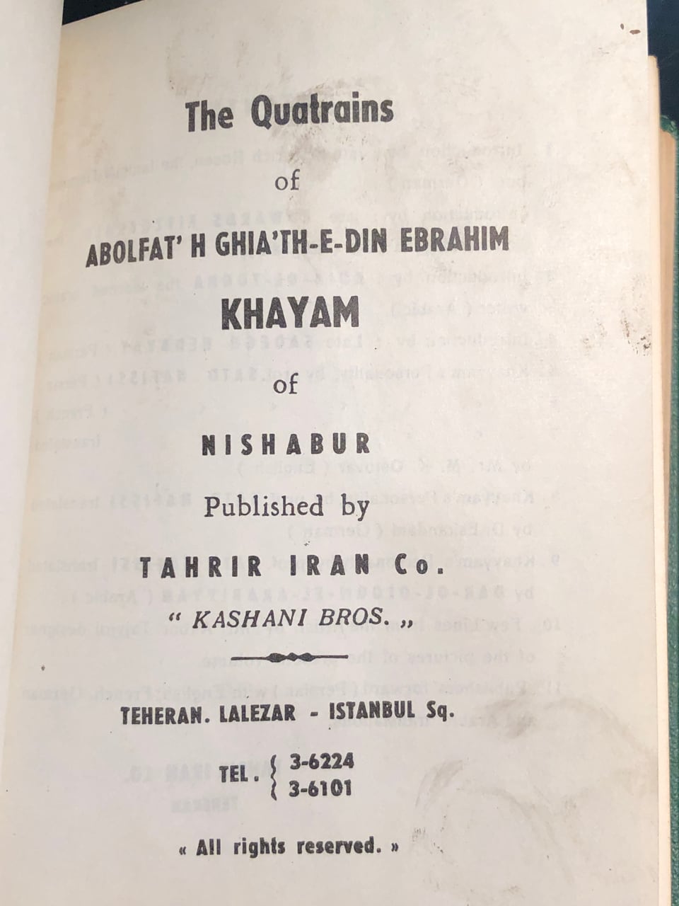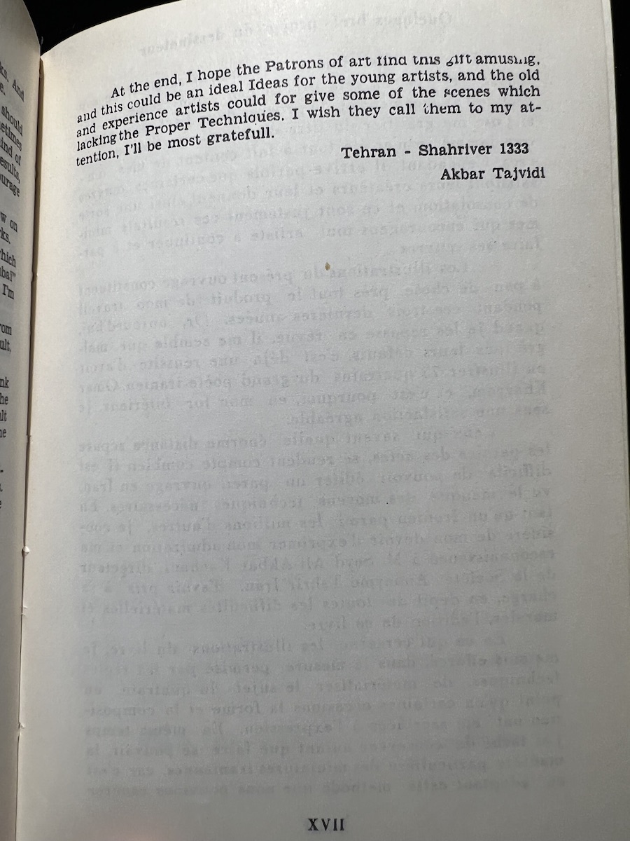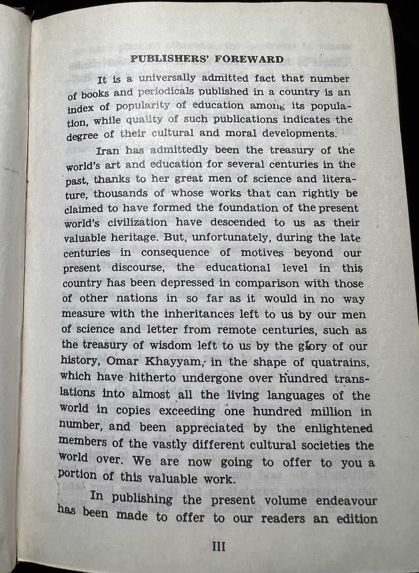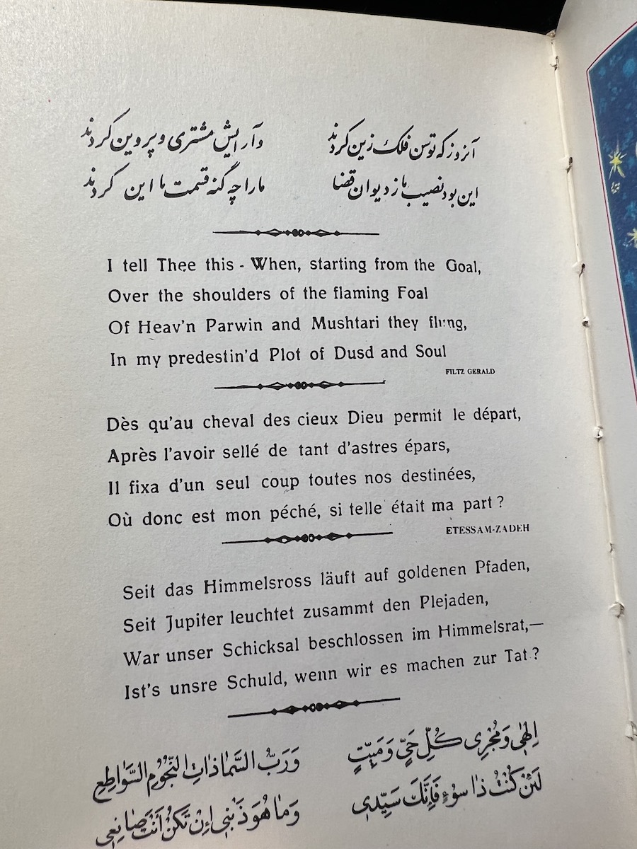 Due to its multiple translations, the book orientation seems…flexible. I can’t confirm since I can’t read Arabic, but the book seems to be right to left for it. Both sides seems to have a title page and the important content. The numbering increases from right to left, but the non-Arabic content proceeds normally left to right. The table of contents seems to be backwards from the left-to-right perspective. So last in the order is the first you experience if reading from left to right. It is very confusing for me to parse out. I am guessing the Persian text is alongside all the other translations even though it should also be from right to left from my understanding…