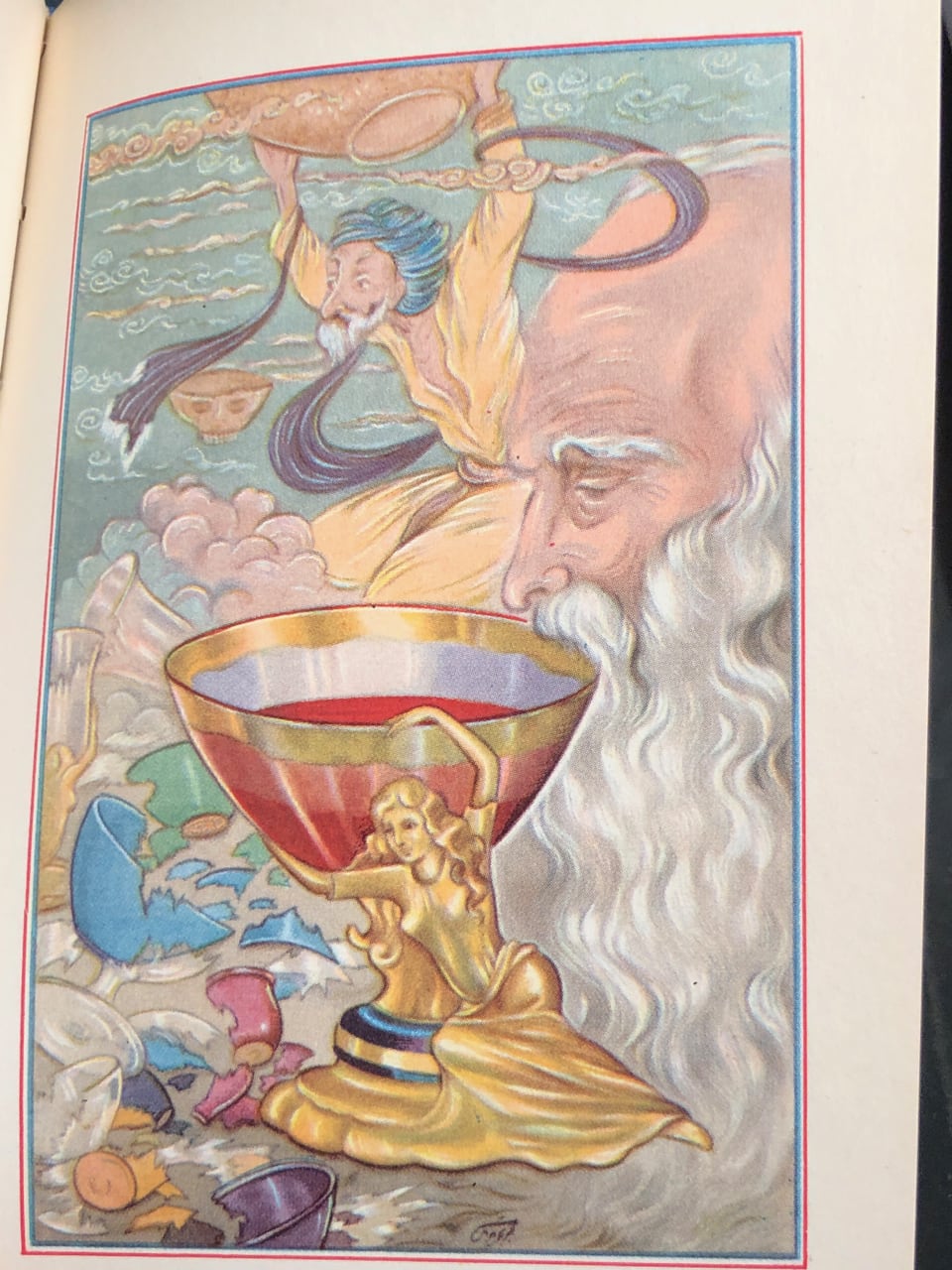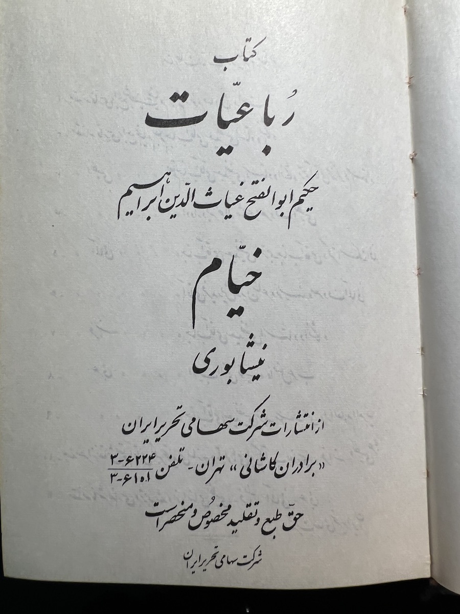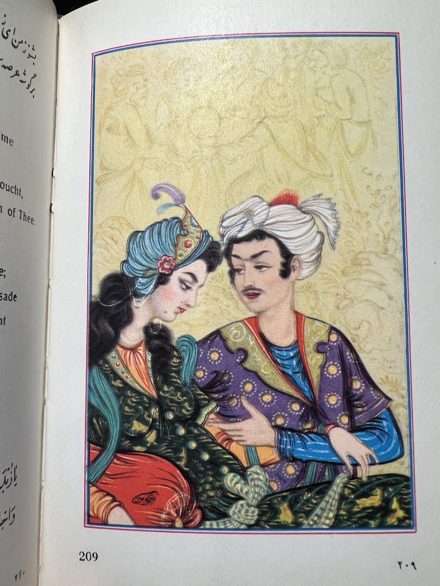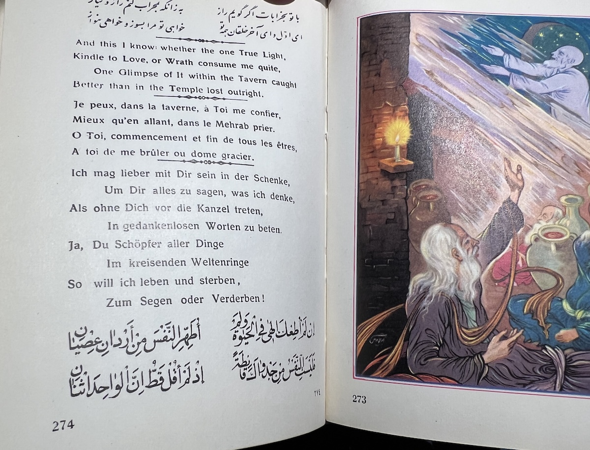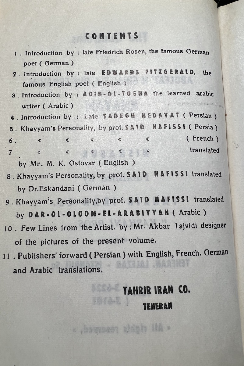 This Iranian edition from the Tahrir Iran Co., with illustrations from Akbar Tajvidi contains five different translations: English, Persian/Farsi, French, German (sans 8 quatrains), and Arabic. Fitzgerald’s is used for the English tranaslations, and due to that, it is limited to 75 quatrains. The publishers’ foreward explains in detail their reasoning and choices.