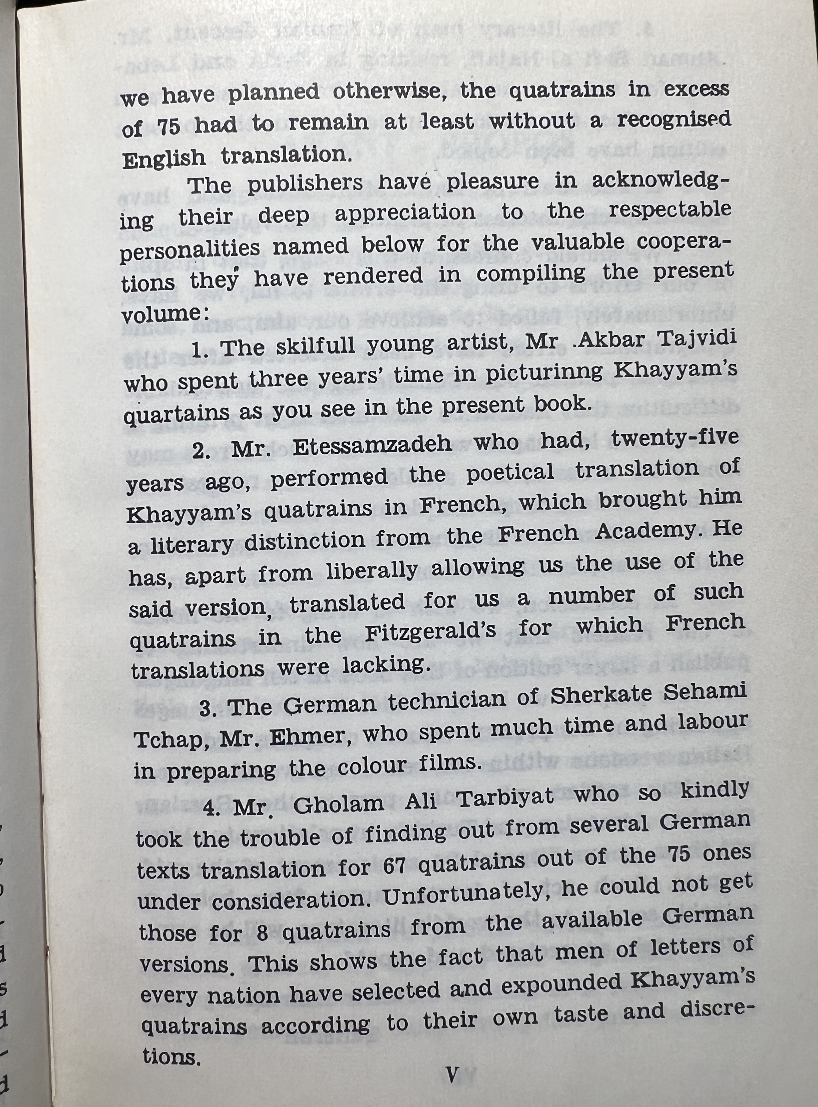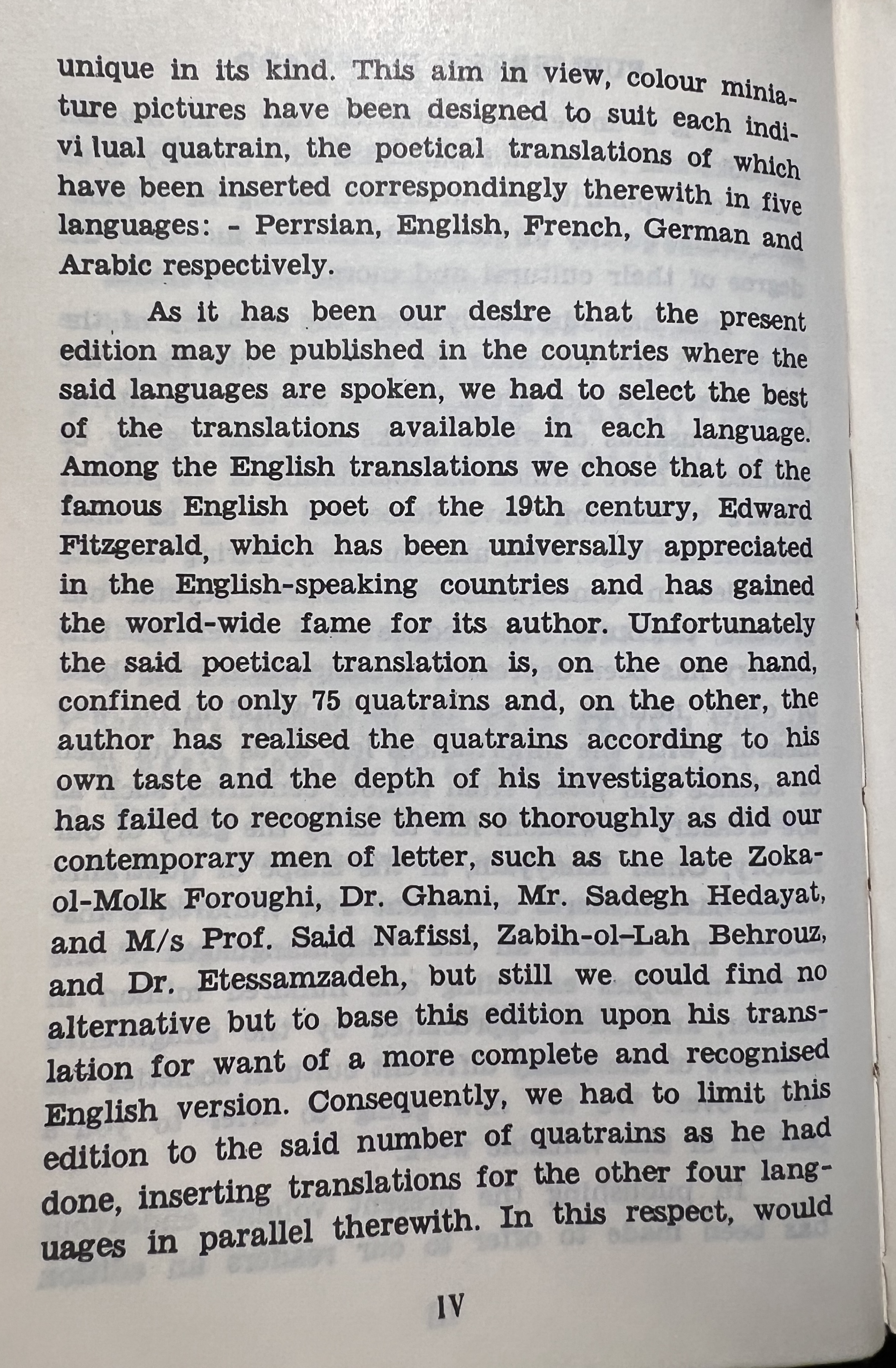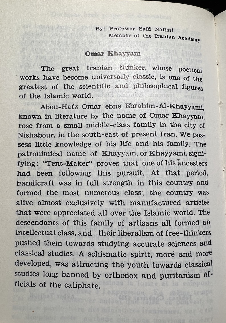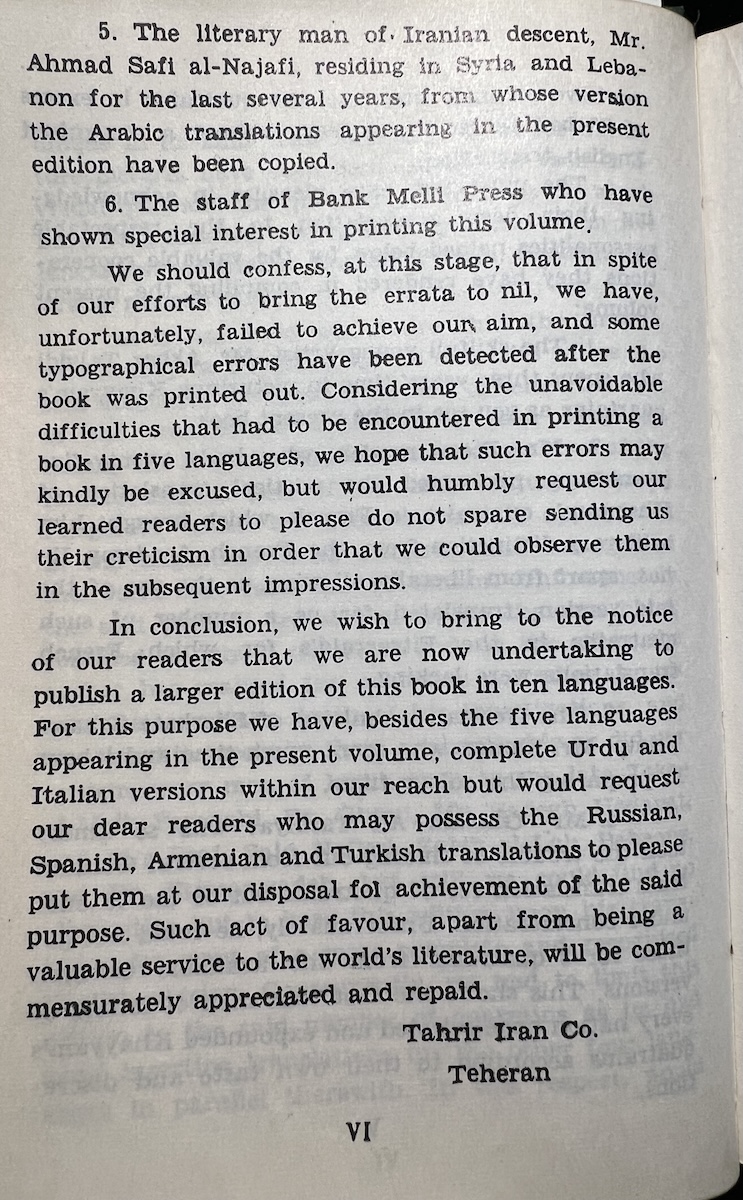 Due to its multiple translations, the book orientation seems…flexible. I can’t confirm since I can’t read Arabic, but the book seems to be right to left for it. Both sides seems to have a title page and the important content. The numbering increases from right to left, but the non-Arabic content proceeds normally left to right. The table of contents seems to be backwards from the left-to-right perspective. So last in the order is the first you experience if reading from left to right. It is very confusing for me to parse out. I am guessing the Persian text is alongside all the other translations even though it should also be from right to left from my understanding…